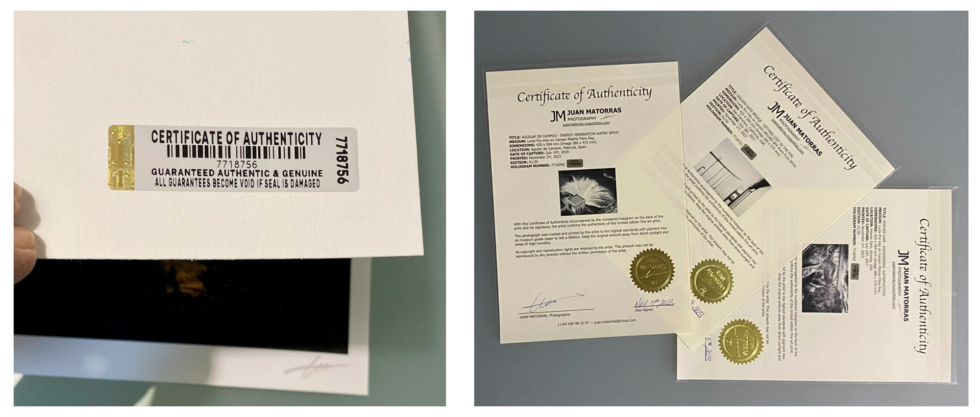 - Cada obra va acompañada de un Certificado de Autenticidad (CoA) sellado, con un número de serie único, una miniatura de la impresión con todos los detalles sobre la fotografía y los materiales de impresión, fechada y firmada a mano. (Nota: el CoA se envía dentro de una bolsa protectora en caso de que desee fijarlo a la parte posterior del trabajo enmarcado).